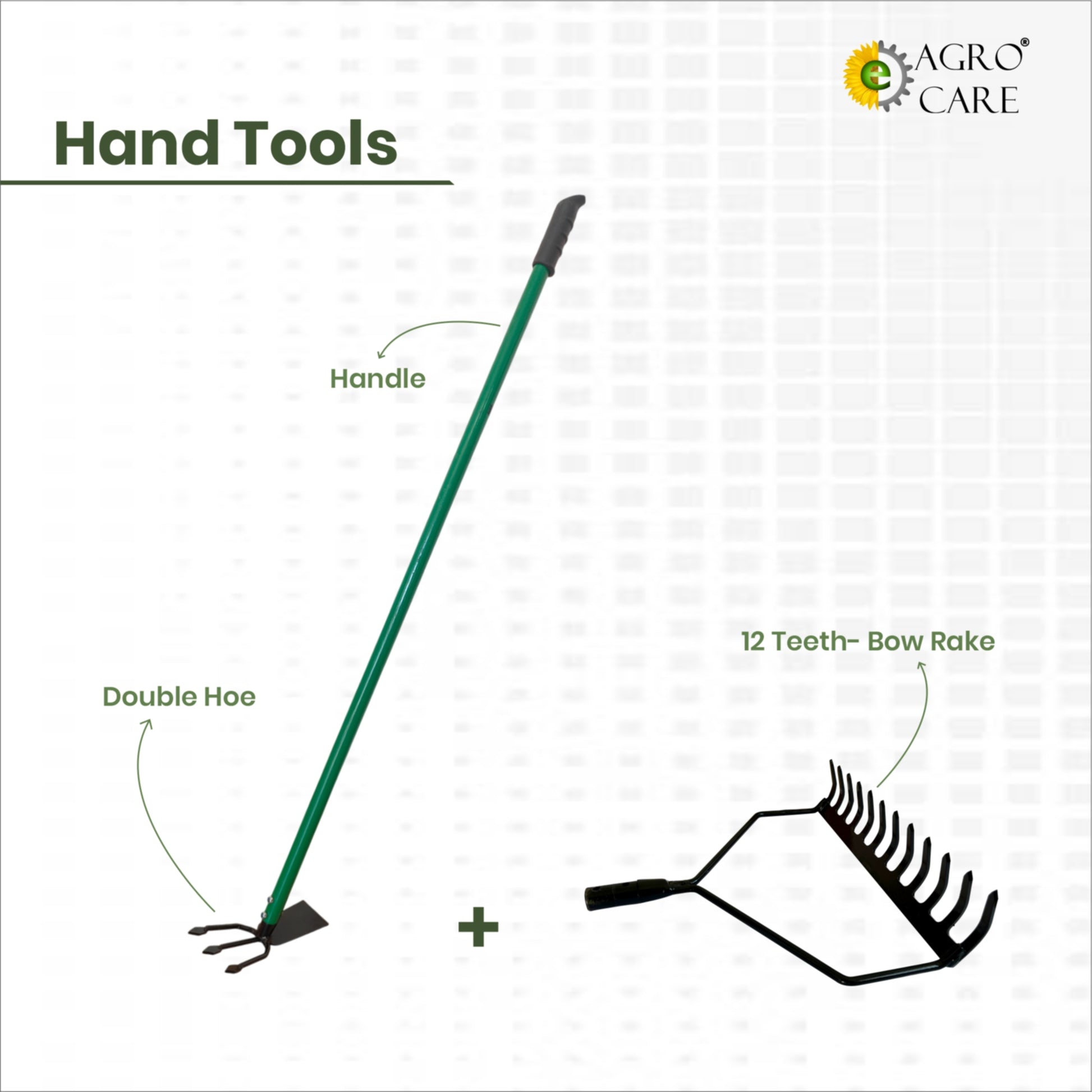 हैंडल और 12-दांतों वाले बो रेक के साथ डबल हो एक बहुमुखी बागवानी टूलसेट है, जिसे कुशल मिट्टी की खेती और रखरखाव के लिए डिज़ाइन किया गया है।