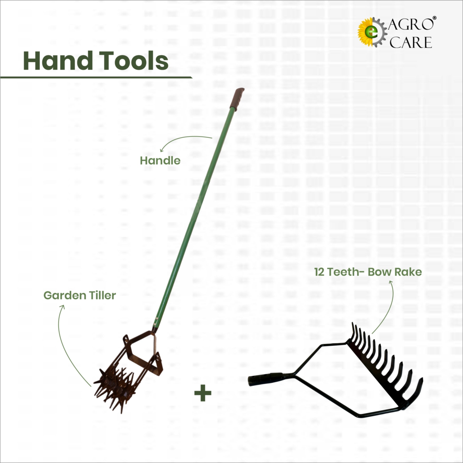 हैंडल और 12-दांतों वाले बो रेक के साथ गार्डन टिलर मिट्टी की तैयारी और रखरखाव के लिए एक बहुमुखी टूलसेट है।